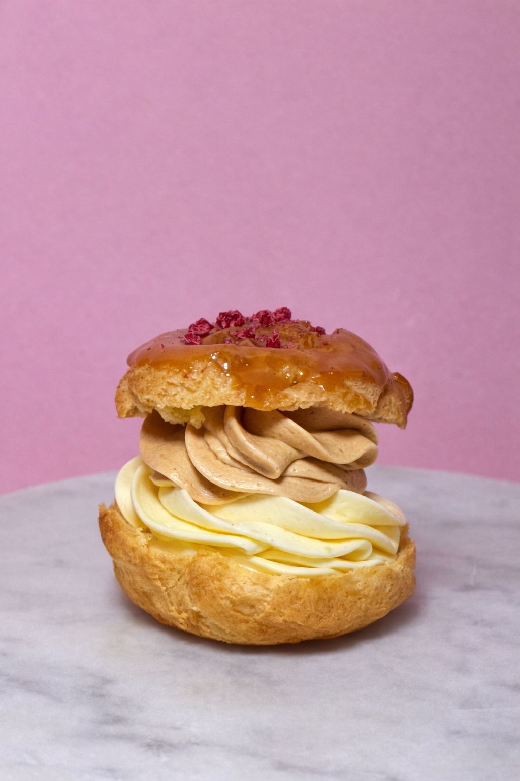 10x Mini Choux s vaječný likérom a čučoriedkový confit, vanilková chantilly a Lyofilizované maliny 70g