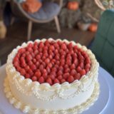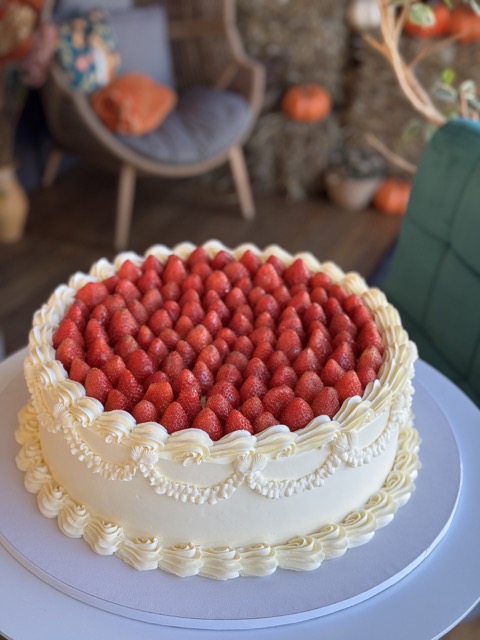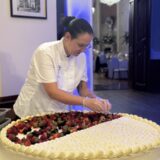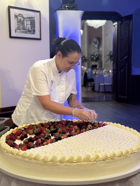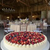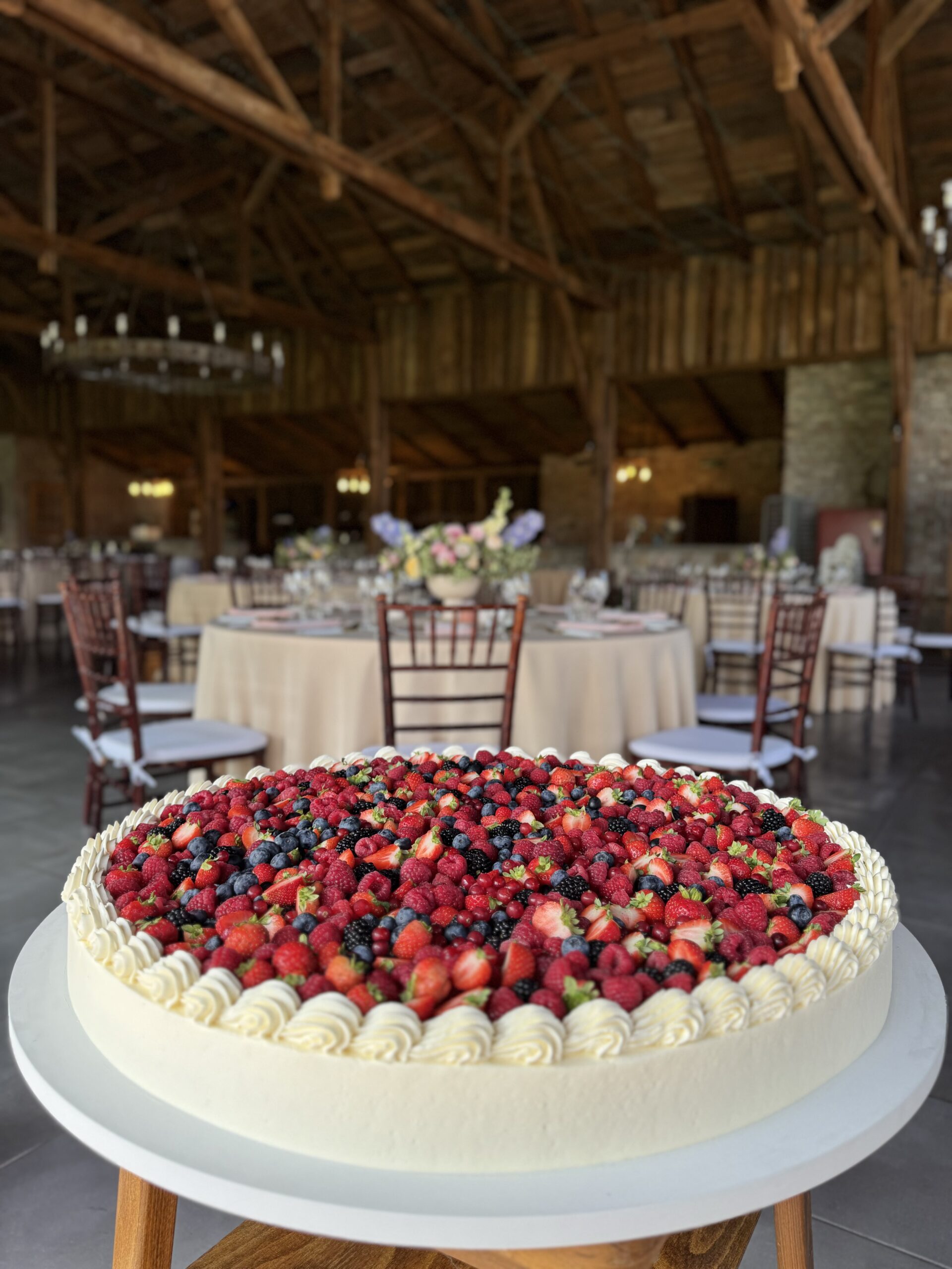 Elegantná svadobná torta v talianskom štýle je dokonalou voľbou pre páry, ktoré hľadajú nadčasový dizajn a prémiový vzhľad. Torta má kruhový tvar, čím sa stáva výraznou dominantou svadobnej hostiny. Vrchná časť torty je bohato zdobená čerstvým ovocím, ktoré jej dodáva sviežosť, farebný kontrast a luxusný vizuálny dojem.